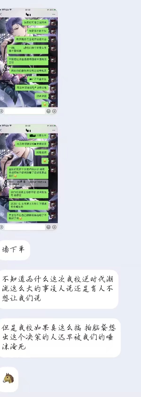 笔者自身也感觉到学校的规矩不太合理,但是笔者几乎没有听到过学校对此哪怕一句合理的解释,历届学生口中的”自由”,”开放“荡然无存,只剩下一刀切式的管理和为了严格而严格的规定,这样的事情发生一次两次还可以理解,但一而再再而三的发生是否说明校领导为了自身的政绩而不顾及学生感受呢?